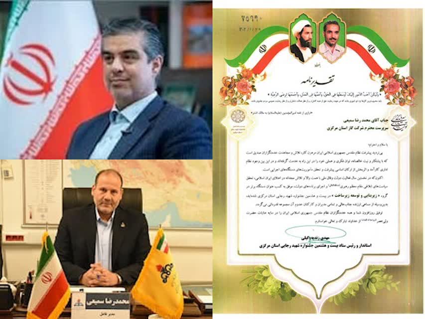 اکنون که در نخستین سال فعالیت دولت وفاق ملی با همت والا و تلاش مجدانه در اعتلای ایران اسلامی، تحقق سیاست های ابلاغی مقام معظم رهبری (مدظله العالی) و اجرای برنامه های دولت، موفق به کسب عنوان دستگاه برتر در گروه زیربنایی و توسعه زیر ساخت در بیست و هشتمین جشنواره شهید رجایی استان مرکزی شده اید بدین وسیله از مساعی ارزنده جناب عالی و تمامی مدیران و کارکنان خدوم آن مجموعه قدردانی می گرد.